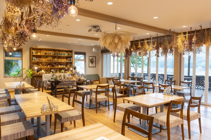 店内に入ると窓が大きくとられ、川に面した窓の外にはウッドデッキのテラスも広がっています。目の前には木曽川と対岸に広がる山々や自然の風景。周囲には桜も植えられていて、季節になると花吹雪が舞い散る中、ティータイムを過ごすことができます。