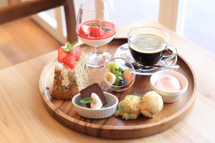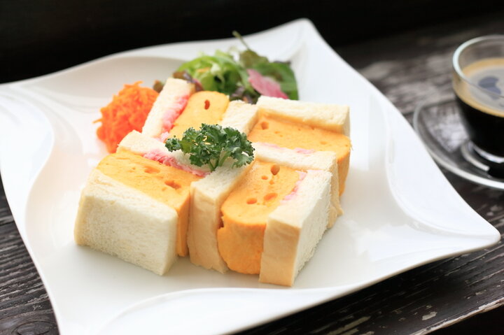 「サクラテーブル」にはさまざまなメニューがあり、パスタや肉料理などメインディッシュが選べるしっかりランチのほか、軽食やケーキ、パフェなども。その時の気分に合わせて楽しむことができます。新たな名物にと作り上げた「厚焼き玉子サンド」は、ピクルスの代りに甘酢の効いたガリが入っていて、甘味のある卵やパンを引き立てるアクセントに。ほかにもローストビーフサンドやフルーツサンドなどが楽しめますよ。