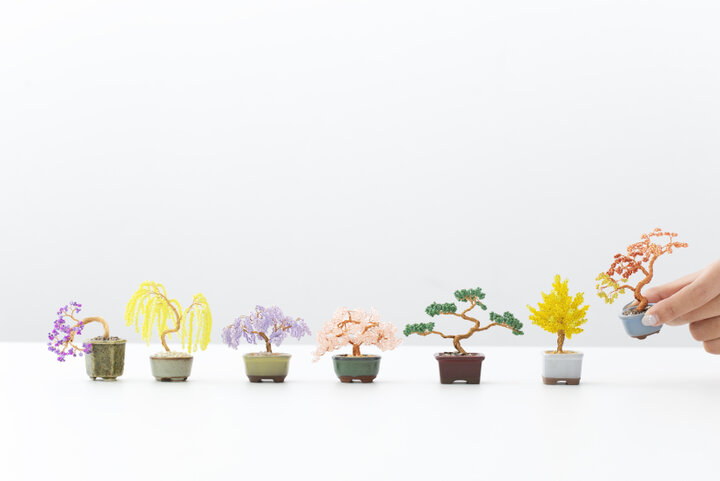 こちらも、ビーズ、ワイヤー、粘土、砂利、鉢、説明書と、必要なものはセットになっています。 とても精巧に見えるつくりに、「難しそう」「できるかな?」と不安になりますが、ワイヤーにビーズを通し、ねじればOK。 ひとつひとつビーズを手で通して出来上がったミニ盆栽は、思い入れもひとしお。愛着がわく可愛さです。 ビースはすべて日本製。「MIYUKI」の「シードビーズ」(種のように小さなビーズ)です。国内外の愛好家からも高く評価される同メーカーの自慢のビーズで、花や葉の繊細なディテールまで表現してくれます。
