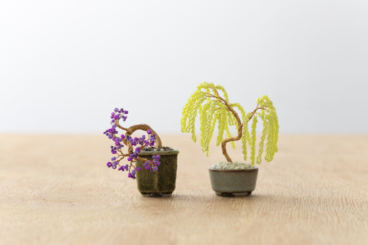 2026年春夏の新デザインが登場。(左)房状につける小さな実まで表現された「紫式部」(右)風に揺れる美しい細枝を粒の小さなビーズで表現した「柳」