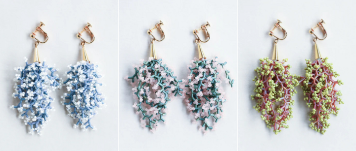 最後にご紹介するのが、身近な樹木をモチーフにしたアクセサリーキット。ボリュームたっぷり。色とりどりのイヤリングで耳元を華やかにしてくれます。モチーフは、「サワフタギ」や「アセビ」、「サンショウ」など。どれも日本で親しまれている植物たちです。