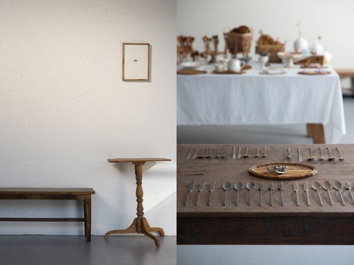 古びた倉庫の扉を開けると、洗練された空間が広がるカトラリーショップ「コノヒノ道具店」。木製のアンティークテーブルに、細身でクラシカルなデザインが特徴のカトラリーが整然と並びます。ものづくりにおいて、ストーリーを大事にしている店主の樫原さん。売る過程も作品の一部との想いで、物語を感じる店内レイアウトを心がけています。