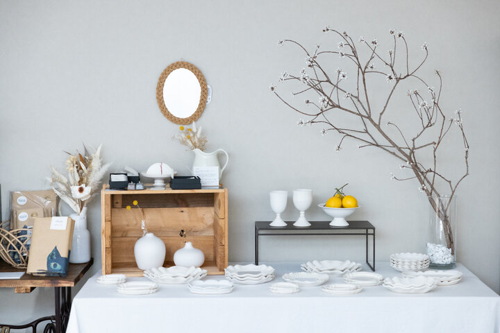 店内では、カトラリーと一緒に食事を彩る食器をメインに、暮らしにまつわる道具も販売しています。取り扱う作品はどれも樫原さん自身がセレクトした作家のもので、手作りの温かみに満ちています。料理が映えるシンプルな器には、樫原さんの作品同様、背景やストーリーが込められています。