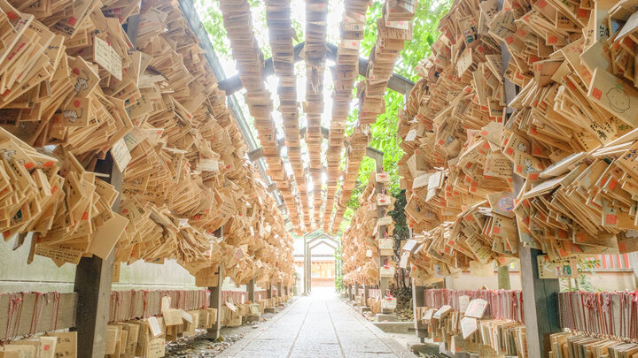3万枚以上が奉納され、祈りを集めている「絵馬のトンネル」