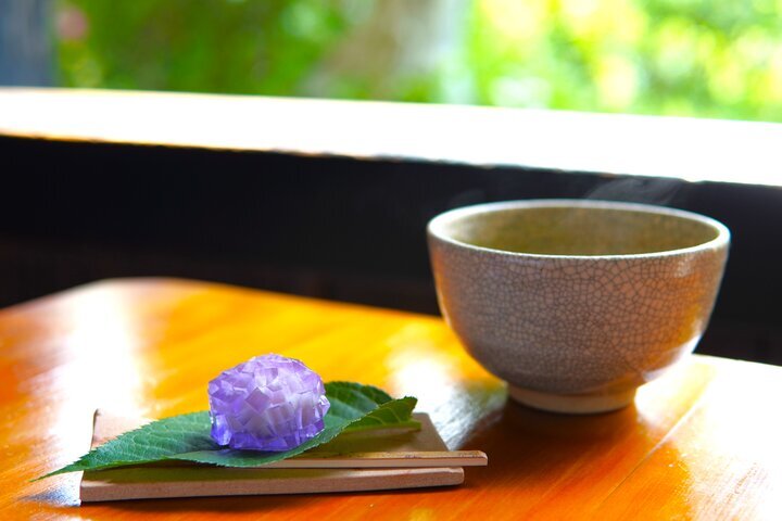楽しいあじさい散策の最後は老舗和菓子店の「御菓子司 こまき」でゆったりくつろいで。抹茶とともに味わう和菓子は北鎌倉の四季をイメージし、そのバリエーションは100種類以上にものぼり、毎日変わることもあるのだとか。6月はあじさいをモチーフにした上生菓子です。