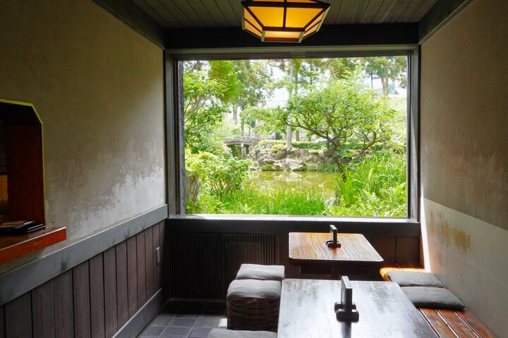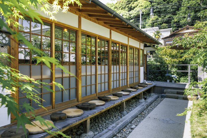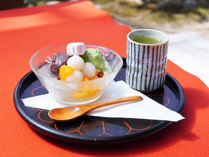 白玉にマシュマロ、あずき餡や抹茶アイスクリームなどを華やかに盛り合わせたあんみつは、徐々に暑さを増してくるこの季節に、おすすめの甘味。テラスの縁台で日本茶をいただきながらぜひ味わって。