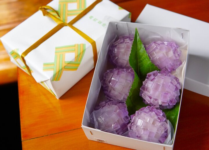 紫色の錦玉(きんぎょく)という寒天をさいの目にカットして白あんにまとわせたお菓子です。涼しげで透明感もあり、雨に濡れるアジサイのよう。手土産にもおすすめですよ。