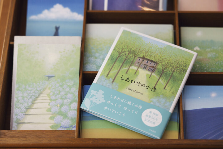 繊細なタッチの絵葉書(160円)や書籍『しあわせの小径』(1650円)