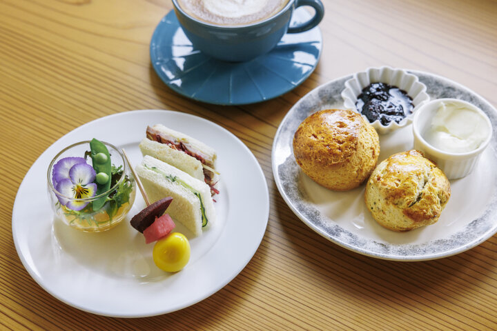 スコーンはプレーンとアールグレイの2種類で、焼きたてが提供されます。二つに割ると湯気が立ちあがるほど。温かいうちに召し上がれ。