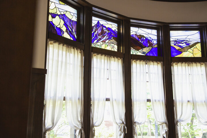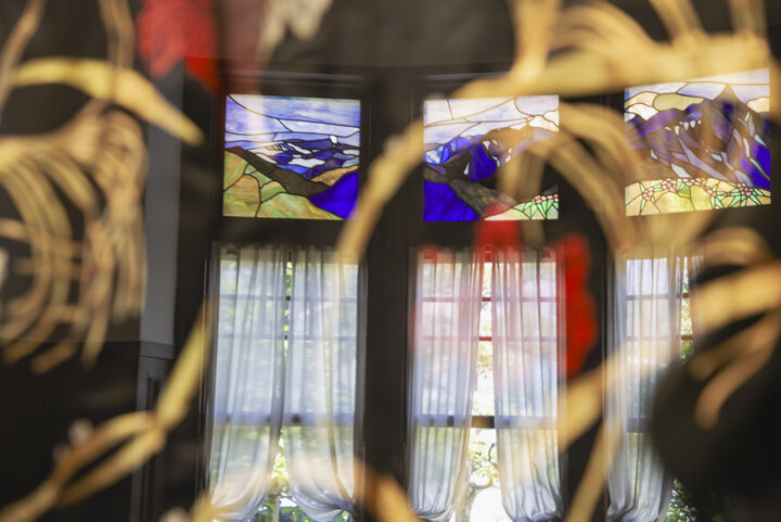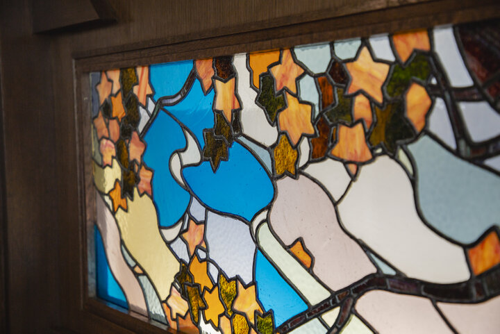 2階の展示室にあるステンドグラスには、貞奴の好きなもみじがあしらわれている