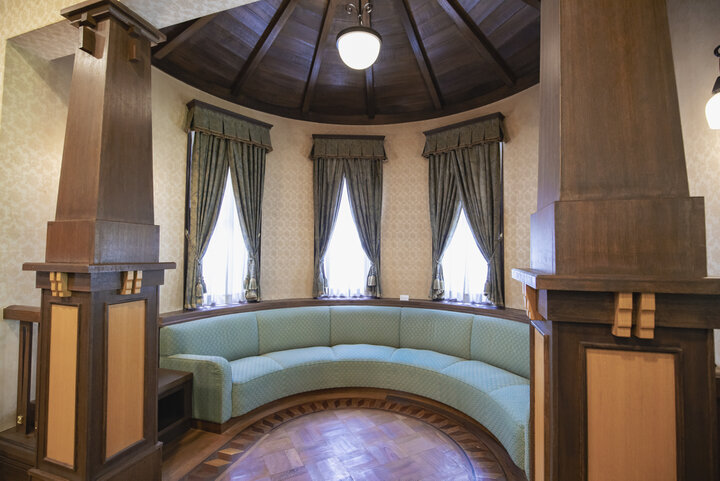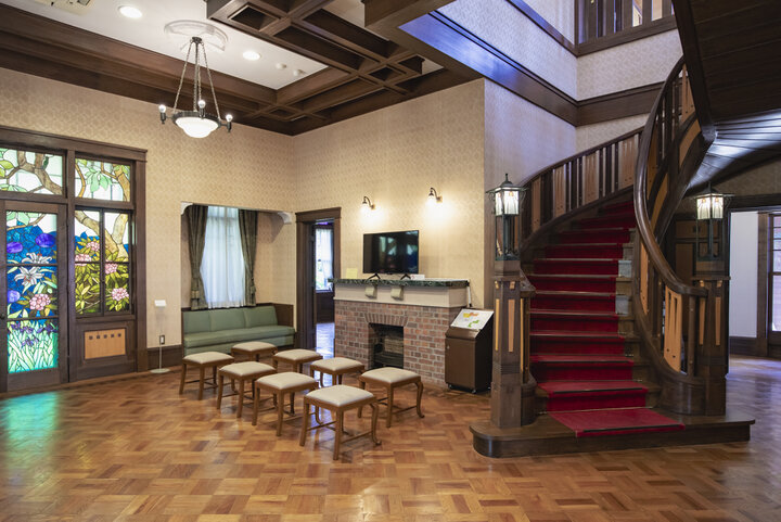 1階の大広間に入ると、その優雅さに魅せられます。部屋の一面には大きなステンドグラス。「初夏」をテーマに、季節の草花や鳥などが描かれています。入口の横にも「踊り子」と題した、趣の異なるステンドグラスが飾られ、大広間を華やかに彩っています。半円形のソファがあるコーナーではきっと当時も、訪れたゲストがくつろいだはず。その正面の螺旋階段を降りてくる貞奴は、まさに舞台に登場する女優のように見えたことでしょう。政財界人や文化人など、屋敷を訪ねた特別なゲストを魅了する仕掛けが、そこかしこに感じられます。