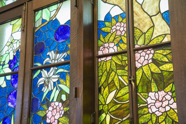 電力王の屋敷にふさわしく、電灯が点いていた二葉館。夜にはこのステンドグラスを通して外に灯りが漏れ、幻想的に映ったはず