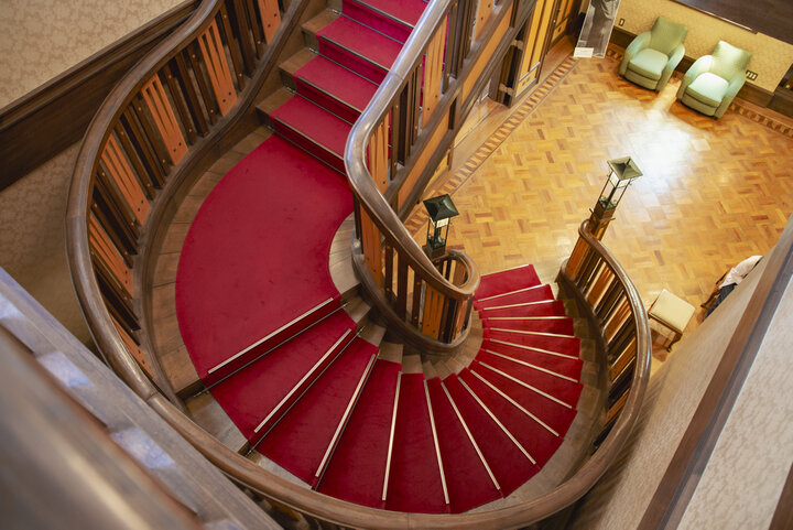 ステンドグラスや螺旋階段など見どころが多い、大広間