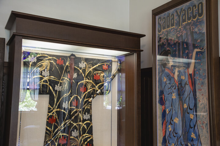 大広間の隣は、貞奴の生涯や女優としての活躍を伝える資料が見られる展示室。唯一残っている舞台衣装や、パリ万博の舞台出演時に制作されたポスターのレプリカが印象的です。貞奴のことを伝えた当時の新聞記事や、貞奴の姿がわかるポストカードなど興味深い資料がいっぱい。ピカソが描いた貞奴の絵が掲載されたフランスの雑誌や、桃介に関する資料も展示されています。