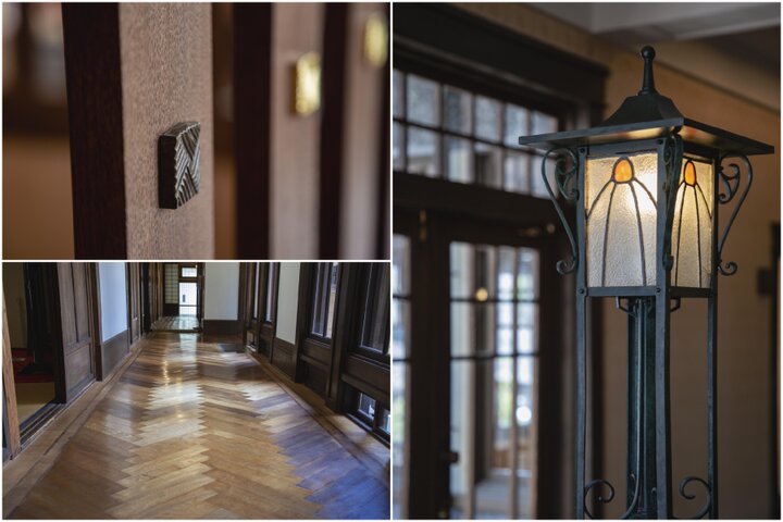 階段周りの照明や金具などは、一部がオリジナルなので、他と見比べてみて(左上・右)。1階の廊下は当初と復元の材料がわかりやすく、色合いが異なる(左下)