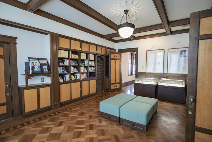 建物の2階は、郷土ゆかりの文学資料の展示が中心です。近代文学の礎を築いた坪内逍遥や、直木賞作家の城山三郎、『ぼくらの七日間戦争』の著者、宗田理など、名古屋を中心とする郷土ゆかりの文学者や作品を資料やパネルで紹介しています。手に取って自由に閲覧できる資料もあるので、ゆっくりページをめくってみてはいかがでしょう。和室の方も、貸室として使われていない場合は見学できるので、覗いてみてくださいね。