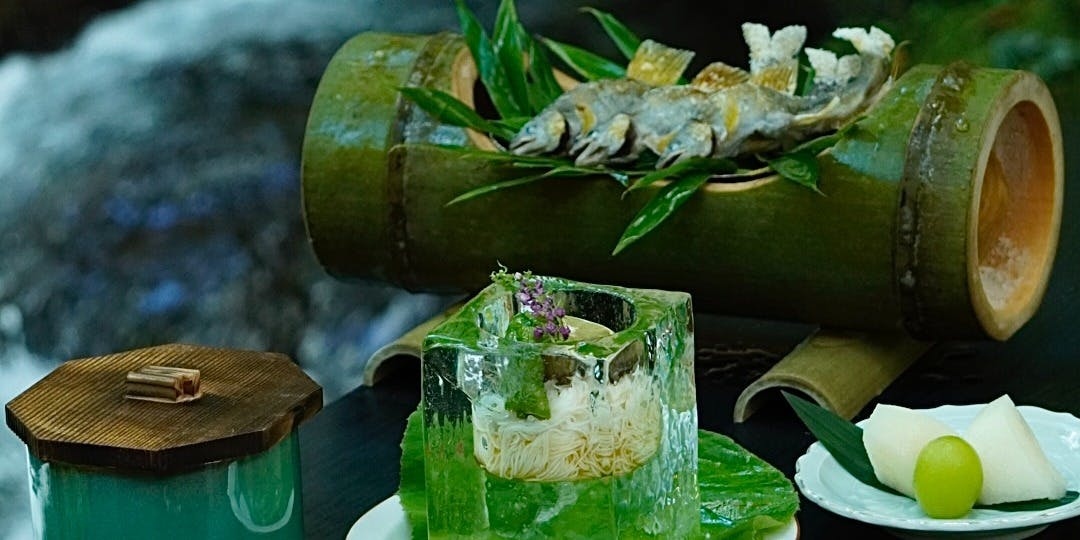 新緑が瑞々しい初夏から秋の兆しを感じる納涼まで、ここ奥貴船でしか味わえない川、山、里の恵みを楽しめるコース「おくきふね会席」。焼物には創業当時から続く伝統の鮎の笹焼きが登場し、青い笹の香りと竹筒に包まれた香ばしい鮎が川床に彩りを添えます。また盛夏の時期は氷の器で楽しめる氷室そうめんを、初夏や秋口には季節の野菜と和牛の小鍋で温まることができます。