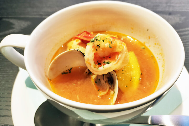 客室だけでなく、2025年6月から、夕食メニューもさらに豪華に進化。スタンダードプランでも、金目鯛・アワビ・ブイヤベースを一度に楽しめるようになりました。 スタンダードプランは、全11品からなる季節ごとの創作会席。お刺身はどれも新鮮ですが、なかでもアワビのお造りは格別。貝柱の甘みが際立ち、噛むほどに旨みが広がり、奥深い味わいを堪能できます。