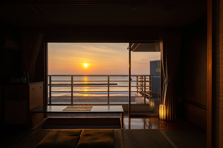 晴れていれば、客室の窓から、水平線の向こうにゆっくりと昇る朝日を眺めることができます。赤く染まる空と海が織りなす幻想的な景色は、旅の特別なひととき。朝の静けさの中で、ゆっくりと流れる時間を感じながら、贅沢な朝を迎えてみては。