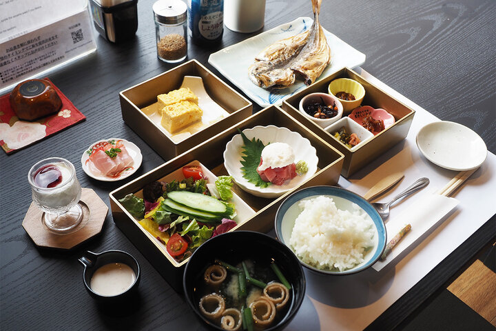 おいしい幸せは、翌朝も続きます。香ばしい干物に、ふんわり焼かれた出汁巻き玉子。そして新鮮なお刺身や彩り豊かなサラダなどが並ぶ、目にも舌にもうれしい朝ごはんです。