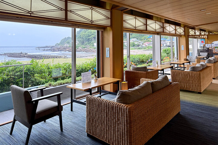 海に向かって大きく開かれた窓があるロビーラウンジ