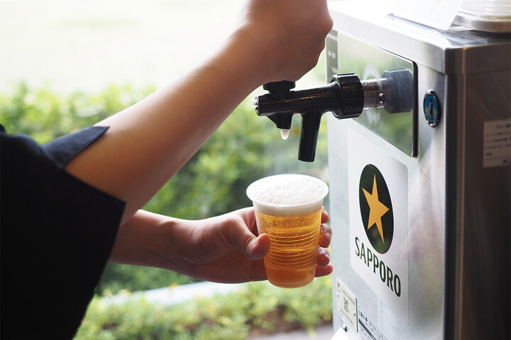 ロビーのセルフドリンクコーナーで、自分で生ビールを注ぐ