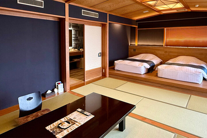 客室は全12室すべてがオーシャンビュー。なかでも最も広いのが、角部屋ならではの開放感が魅力の「温泉露天風呂付(陶器)広々モダン和室」です。 今回のリニューアルで、モダンな和室へと一新。小上がりにマットレスを取り入れ、より快適でくつろげる空間へと生まれ変わりました。 さらに、落ち着いた色合いの中に、伊豆の海の記憶を閉じ込めたような青が映える設えになっています。