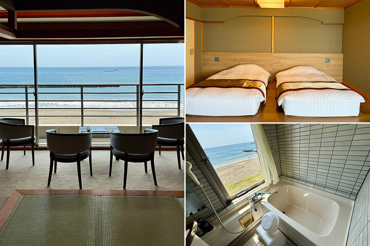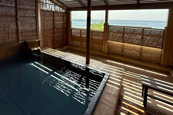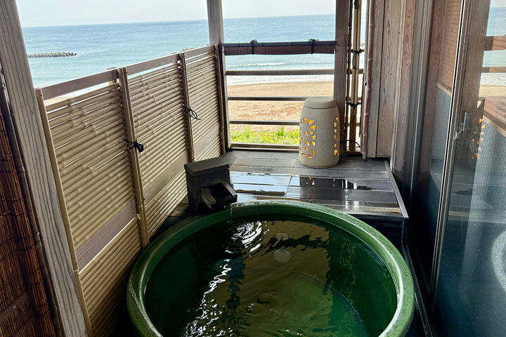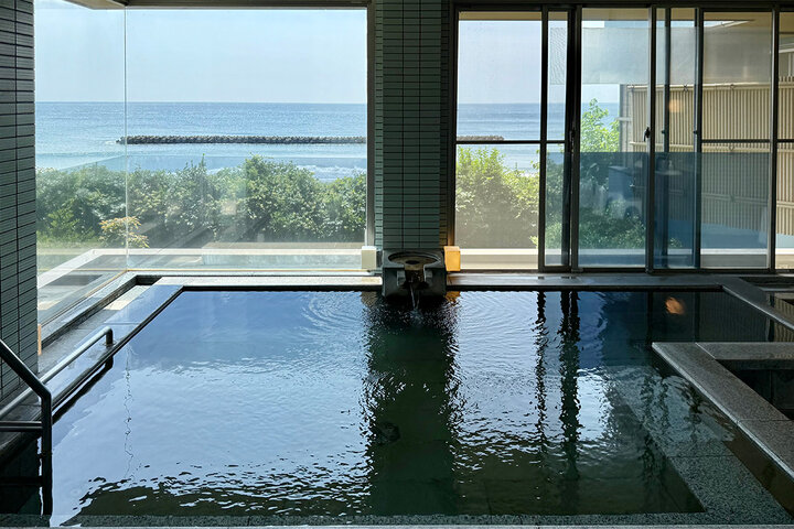 館内には、男女入れ替え制の大浴場がひとつずつ。朝と夜で入れ替わるため、滞在中に異なる趣の湯を楽しめます。 美しい海景色は、宿自慢の大浴場でも。昼間はキラキラ輝く海を眺めながら、夜は深い紺碧の海を感じながら、移ろいゆくパノラマの景色に身を委ねてみて。 泉質は、ナトリウム-塩化物泉。湯冷めしにくく、体を芯から温める効果があるため、夏の冷房冷えにも一役買ってくれますよ。
