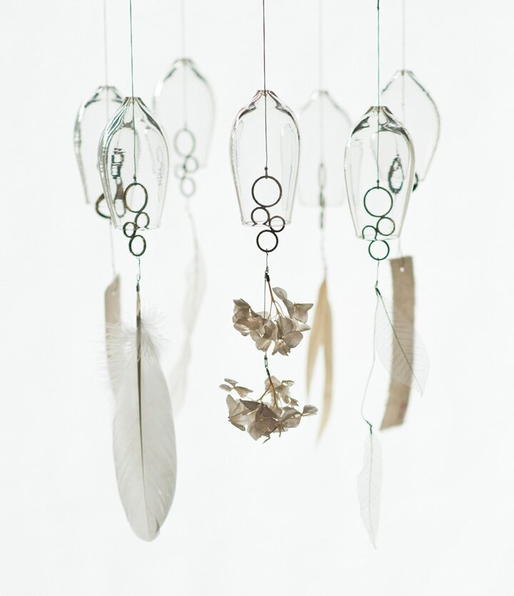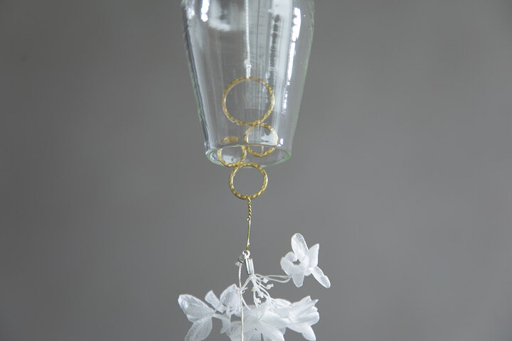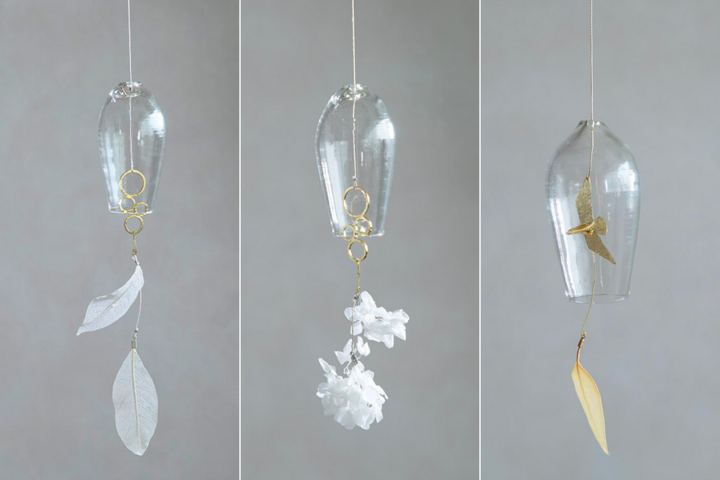 表情豊かな吹きガラスの外身(そとも・風鈴のガラス部分)と、ゆらゆら揺れる可憐なお花や葉の風受けがロマンチックな風鈴。 ガラスは作家の鳥本雄介さんが自身で原料を調合し、丁寧に仕上げた吹きガラス。花や葉はなんと自然のもので、一つ一つに個体差があるそう。軽やかで、風にふわりふわりと揺れるたび、思わず見とれてしまいます。