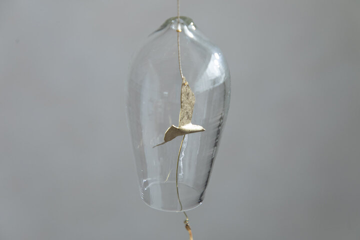 ガラスの中には、まるでアクセサリーのような真鍮の舌(ぜつ)が。ガラスに金属が当たると、キンとした張りのある音を想像しがちですが、この風鈴は「チリン、チリン」と、涼しげで心地よい音を奏でてくれます。