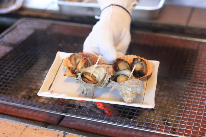 コの字型になったテーブルに炭火焼きの台があり、みわこさんがひとつひとつ魚介を焼き上げてくれるので、焼き立ての料理が目の前に。英虞湾で捕れたヒオウギ貝やサザエは、何もつけずそのまま食べれば自然の塩味が貝の旨味を引き立てていることがよくわかります。スルメイカは食べやすく切って提供。お願いすれば貝なども食べやすいように取り分けてくれますよ。