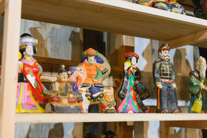 大きな道具類に加えて、レトロな味わいのガラスの器や骨董品のような食器もたくさんそろっています。詳しく鑑定して値段をつけるようなことはしていないので、骨董品としても価値のある、お宝のような品が見つかるかもしれませんよ。ユニークな陶器の人形、土びなも目を引きます。お雛さまから、歌舞伎の登場人物や軍人など、さまざまな種類があり、思わず微笑んでしまうようなものも多いので、じっくり選んでみてくださいね。