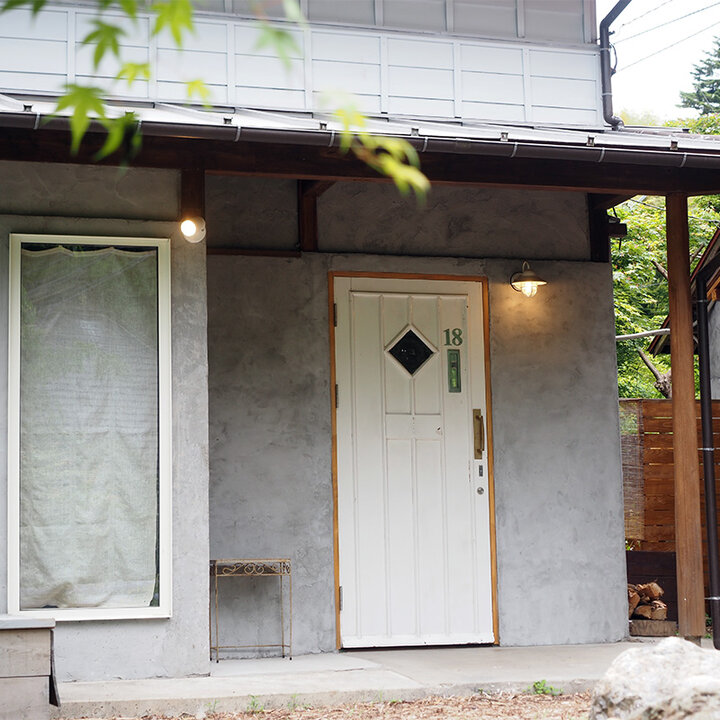 白い木の扉に浮かぶ「18」の数字は、宿のちいさな目印