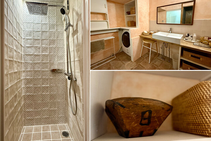 水回りも、「紡舎」らしさがギュッと詰まった空間。シャワールームや洗面所、ランドリーなど、どれも丁寧に整えられています。泊まるだけじゃなく、“暮らす”感覚が味わるのが嬉しい。
