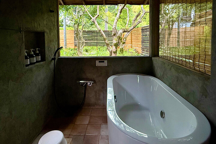 シャワーがある母屋とは別に、離れにはバスタブ付きのお風呂があります。 窓の向こうに広がる森を眺めながら、手足を伸ばして思い切りリフレッシュ……。心の奥にたまっていた疲れが、ゆっくり洗い流されていくようです。 またお風呂には、数種類のバスソルトを用意。その日の気分で香りを選ぶのも、楽しいひととき。