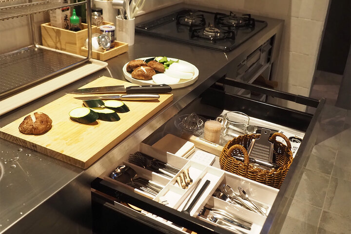 暮らすように楽しむなら、好きな食材を持ち込み、BBQを楽しんで。キッチンは自由に使えて、調理器具や食器、調味料までひと通りそろっています。