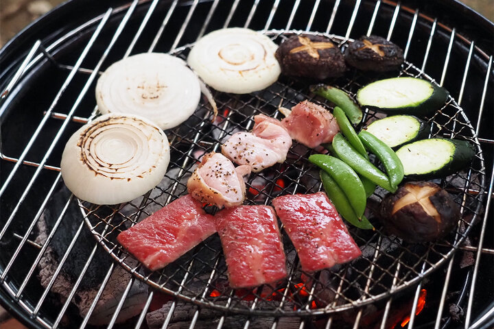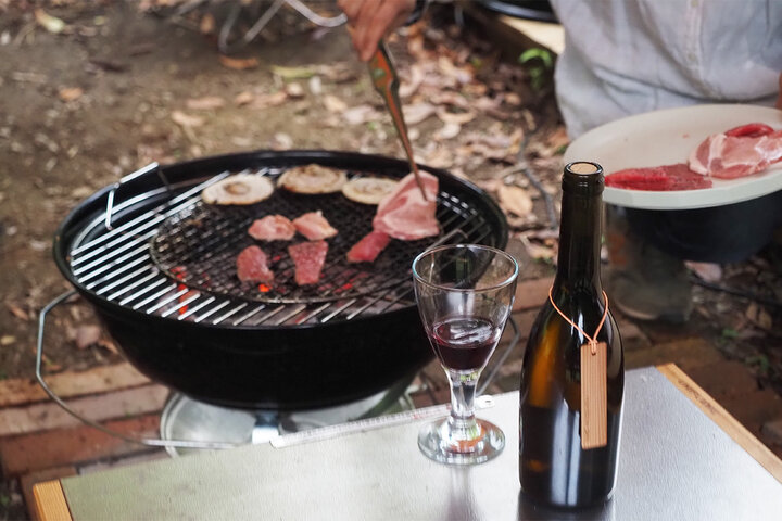食材をカットして、お皿にきれいに並べたら、あとは焼くだけ。広いお庭の一角に設けられたグランピングエリアで、いよいよBBQがスタートです。