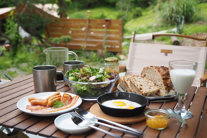 朝食付きプランを選ぶと、冷蔵庫には平飼い卵やベーコン、野菜サラダなど東京産にこだわった食材がすでにスタンバイ。自分で焼いたり盛りつけたりしながら、朝ごはんを作ります。 できあがったらウッドデッキへ。森の空気ごと味わう朝食は、一日のはじまりをやさしく整えてくれますよ。