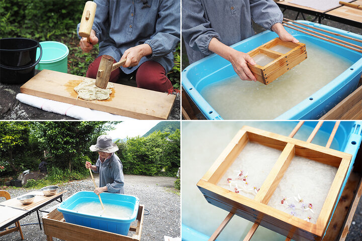 さらに特別な時間を過ごすなら、「東京戸倉和紙」の紙すき体験をぜひ。こちらは、あきる野に暮らす職人さんのご自宅を訪ね、里山の素朴な風景に包まれながら、約2時間かけて、和紙ができるまでの工程をじっくり体感するというもの。 原料である「楮(こうぞ)」の繊維を叩いてほぐす作業は、なかなか力のいる工程。けれど、繰り返すうちに無心になって没頭することで、リフレッシュできます。 「とろろあおい」の根からとった粘液を加え、繊維を水に溶かしたら、いよいよ紙漉きへ。紙漉きのリズムに集中して、気づけば無言で夢中に。自分だけの一枚をすくい上げる瞬間は、何とも言えない達成感を味わえます。