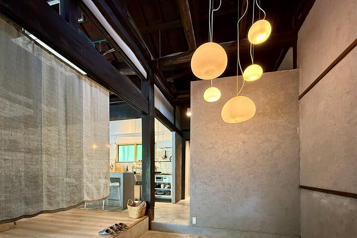 打ちっぱなしのエントランスに浮かぶのは、デンマーク・muutoの「FLUID PENDANT LIGHT」。水滴が落ちる瞬間をイメージした柔らかなフォルムが、川のせせらぎが響くこの場所にぴったり。