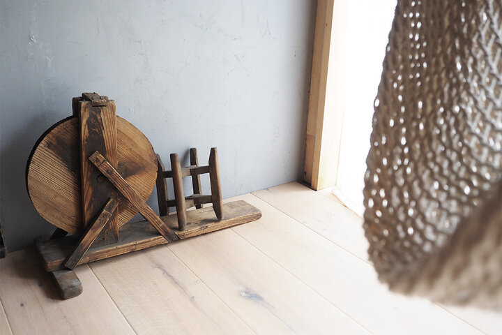 ふと視線に入るのは、この宿がかつて養蚕農家だったことを物語る道具たち。さりげなくおかれた手紡ぎの糸車には、手仕事の温かみがじんわりとにじんでいます。