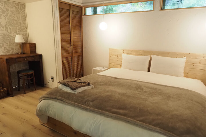 古い建具を開けると、その先に広がるのは、やわらかな光に包まれたベッドルーム。壁際には、アンティークのデンマーク製デスクと、日本の丸椅子が寄り添うように置かれています。デスクまわりは、ちょっと仕事をしたいときにもうってつけ。
