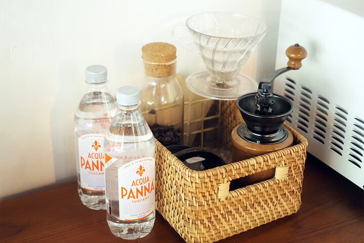 キャビネットの上には、自家焙煎のコーヒー豆とイタリア・トスカーナ産のミネラルウォーター「Acqua Panna」が。棚には、紅茶、ハーブティー、緑茶までそろっていて、どれも自由に楽しめます。※時期によって内容が異なる場合あり。