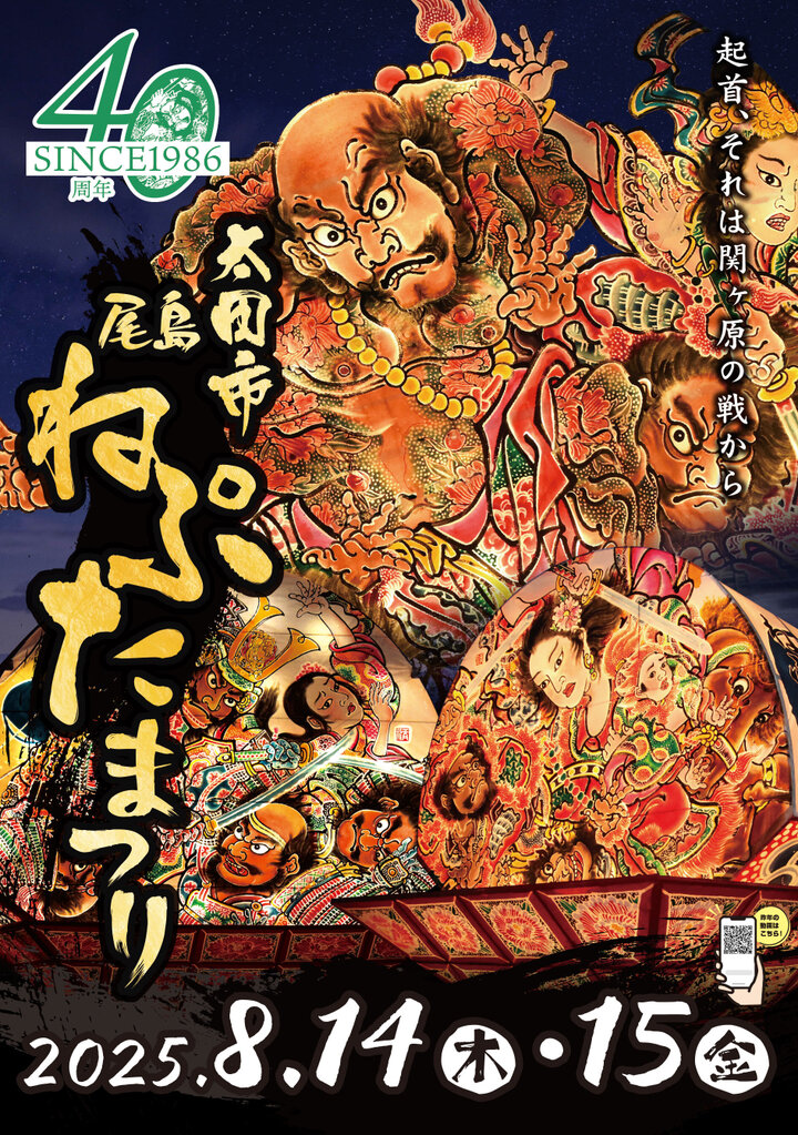 太田市の夏の一大イベント「尾島ねぷたまつり」が令和7年8月14日(木)、15日(金)に開催。高さ約7mの勇壮なねぷたとお囃子の演奏で、出陣団体がまつり会場を盛り上げます。 8月14日(木)は午後3時から津軽物産市、午後6時00分から午後6時30分にオープニング式典、午後6時30分から午後9時にねぷた運行、午後9時から午後9時30分に大合奏が行われます。 8月15日(金)は午後3時から津軽物産市、午後6時15分から午後8時45分にねぷた運行、午後8時45分~午後9時15分に大合奏が行われます。