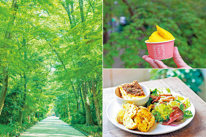 鴨川デルタは、京に暮らす人にとって憩いの場。天気のよい日は、水辺に座っておしゃべりを楽しんだり、ひとり静かに本を読んだり、飛び石をはしゃぎながら渡ったりと、思い思いの時を過ごす人たちの姿を見ることができます。 その背後には、下鴨神社を包み込むようにこんもりと糺ただすの森が茂ります。縄文時代からの記憶をとどめるという、この森の西側に沿った道が下鴨本通です。通りからは、下鴨神社へといざなう小径が幾筋か伸び、お参り帰りにひと息つける昔ながらの茶店やカフェ、スイーツショップが並びます。