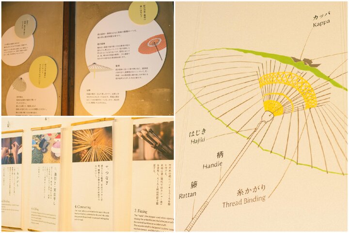 岐阜和傘について、多く寄せられる質問に答えたQ&Aも(左上)。和傘を形作る多くのパーツやいくつもの工程を知ると、和傘の見方が変わるはず