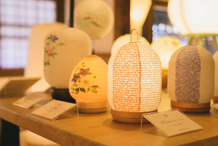 2階に上がると、提灯が集められたコーナー「OZEKI川原町ギャラリー」があります。1891年創業の株式会社オゼキによる岐阜提灯のギャラリーで、伝統的な岐阜提灯からモダンなタイプまで多彩な提灯に出会えます。伝統工芸士が手がけた伝統工芸品の存在感は格別。造形美や繊細な草花の絵柄に魅せられます。現代の暮らしにも取り入れやすそうなシンプルなデザインのものには、時代に寄り添って変化する提灯の新たな可能性も感じられます。