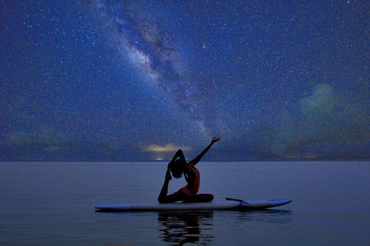 夜のプールで星空を眺めながらSUPヨガ を体験