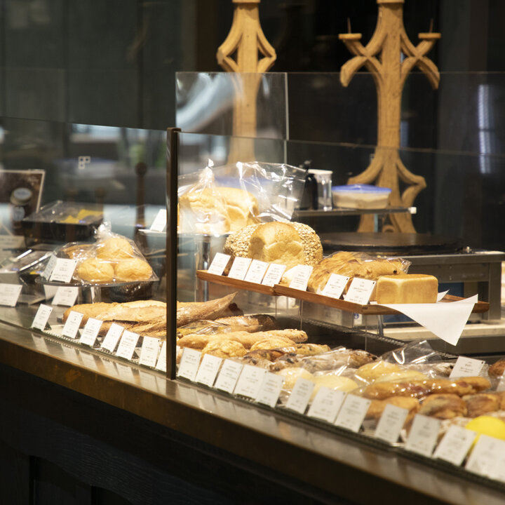 店内は入口の左手にショーケース、右手にカフェスペースという造り。ショーケースには食事パンに総菜パン、スイーツ系のパンと色よく焼き上げられたパンや、焼き菓子が並びます。「軽くても芳醇なテイストと香りを持つ完全オリジナルのパン」を作るために、ポワン エ リーニュの他店舗に置く石臼で自家製粉、その小麦粉を使い仕込みから焼き上げまでの工程を店内の工房で行っています。 質感のいいレンガ積みが印象的なカフェスペースは、アンティークの名作椅子がさり気なく配置された、なんとも上質で贅沢な空間。老舗店が多い神田の土地柄に、アンティーク家具のインテリアがしっくりとなじむようです。