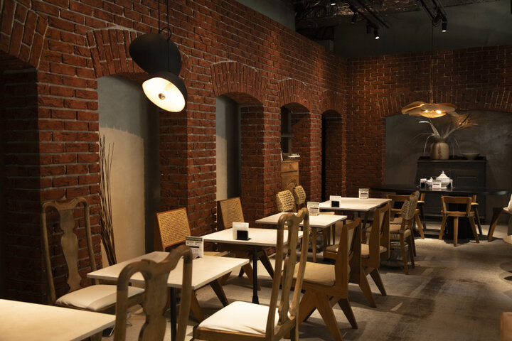ベルギーから取り寄せたというレンガがふんだんに使われた落ち着きのある空間